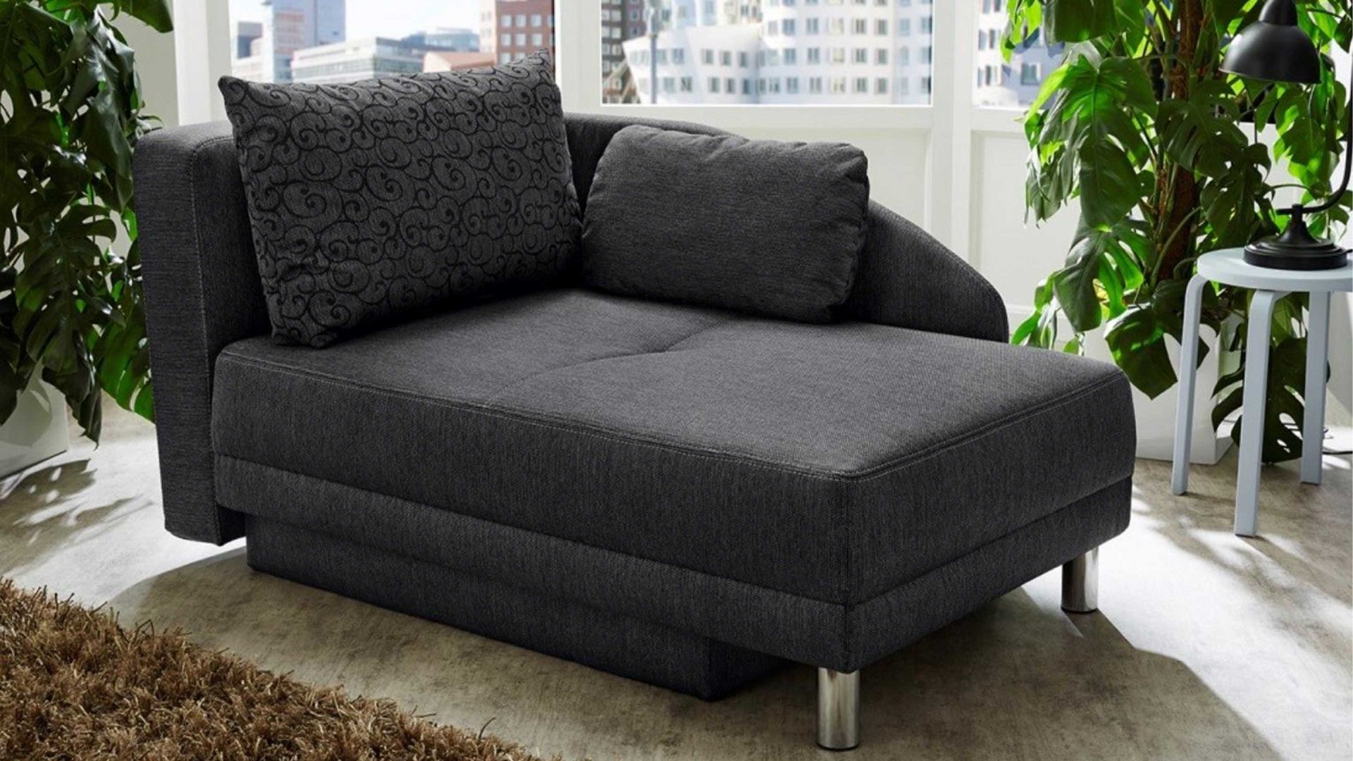 Als funktionale Highlights fungieren der stoffbezogene Rücken und vor allem die Federkernpolsterung - sie sorgt für den hohen Sitzkomfort, den Sie auf dem Sofa genießen. Die Rückenlehne der Couch ist umklappbar, sodass Sie die Recamiere im Handumdrehen zu einem gemütlichen Gästebett mit einer Liegefläche von ca. 84 x 200 cm (BxL) umfunktionieren können - ideal, wenn Verwandte, Freunde oder Bekannte bei Ihnen nächtigen möchten. Auch ein Bettkasten ist in das Sofa integriert, sodass es Stauraum für Decken, Kissen oder sonstige Utensilien offeriert. Sie erhalten das Funktionssofa mit einem losen Rückenkissen sowie einem Zierkissen.