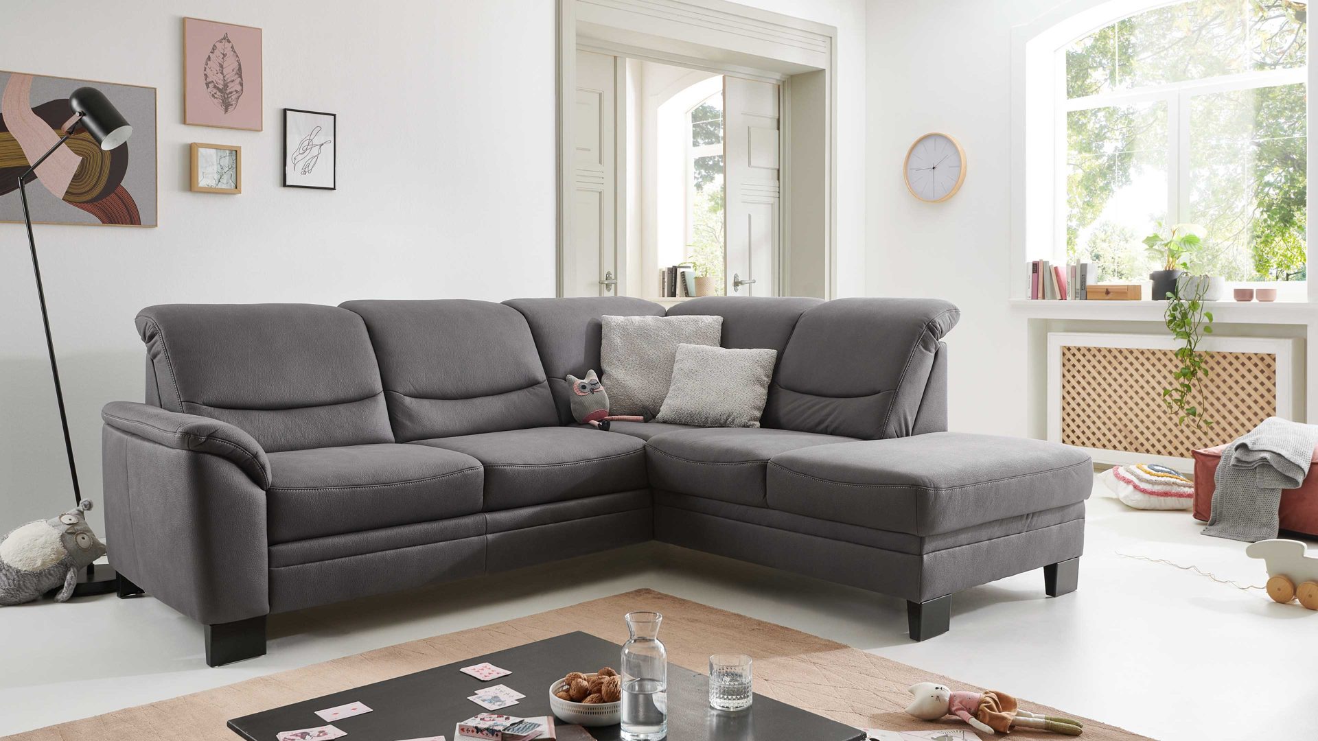 Die gemütliche Couchlandschaft setzt sich aus dem 2,5-Sitzer 2,5LKV mit Armlehne links und dem einsitzigen Kombielement 1KORKV mit offenem Abschluss und Armlehne rechts zusammen. Ihre Stellfläche und das Schenkelmaß belaufen sich auf ca. 254 x 212 cm (LxT, von links nach rechts). Die Sitzhöhe der Polstergarnitur beträgt ca. 46 cm und die Sitztiefe liegt bei ca. 53 cm