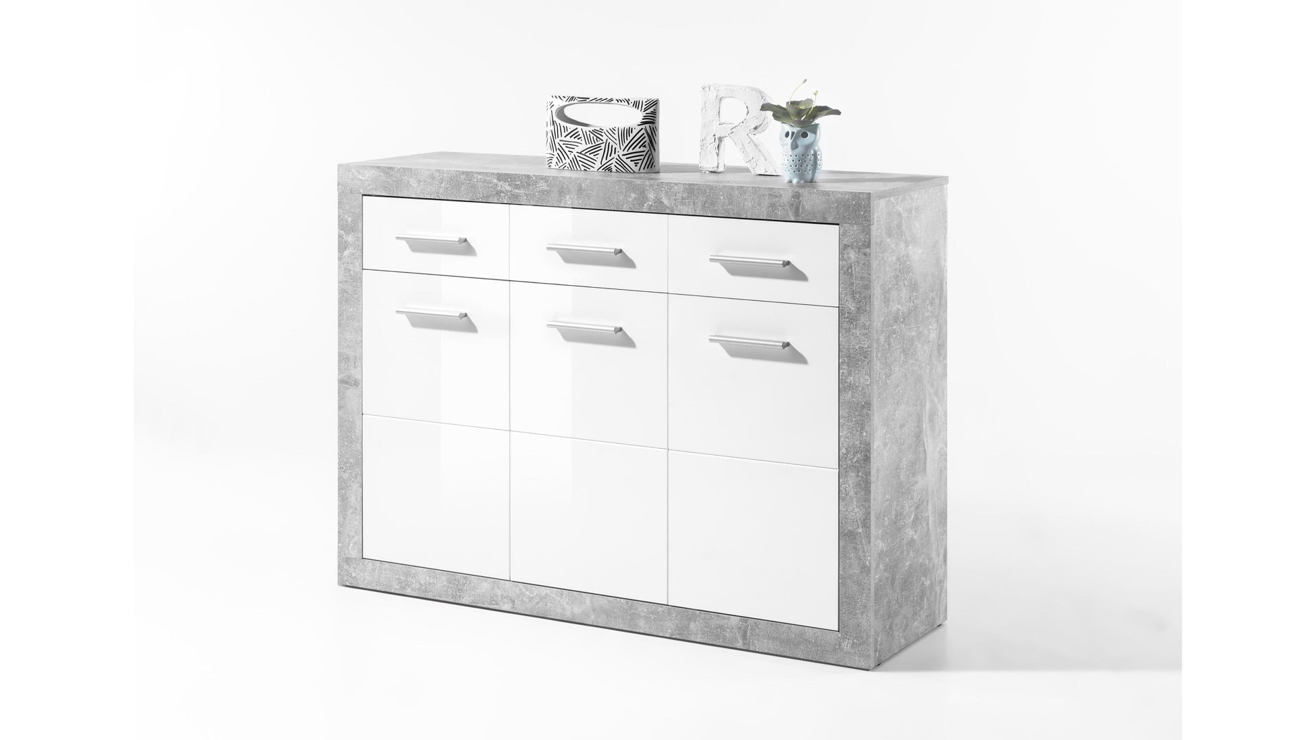 Dank ihrer außergewöhnlich stilvollen Design-Merkmale ist die Kombikommode Stone ein echter Blickfänger. Sie präsentiert sich in edler Beton-Nachbildung kombiniert mit weißen Hochglanzoberflächen. Diese spezielle Farbverbindung harmoniert vorzüglich miteinander und strahlt eine Menge Eleganz aus. Akzente setzen die chromfarbenen Griffe.