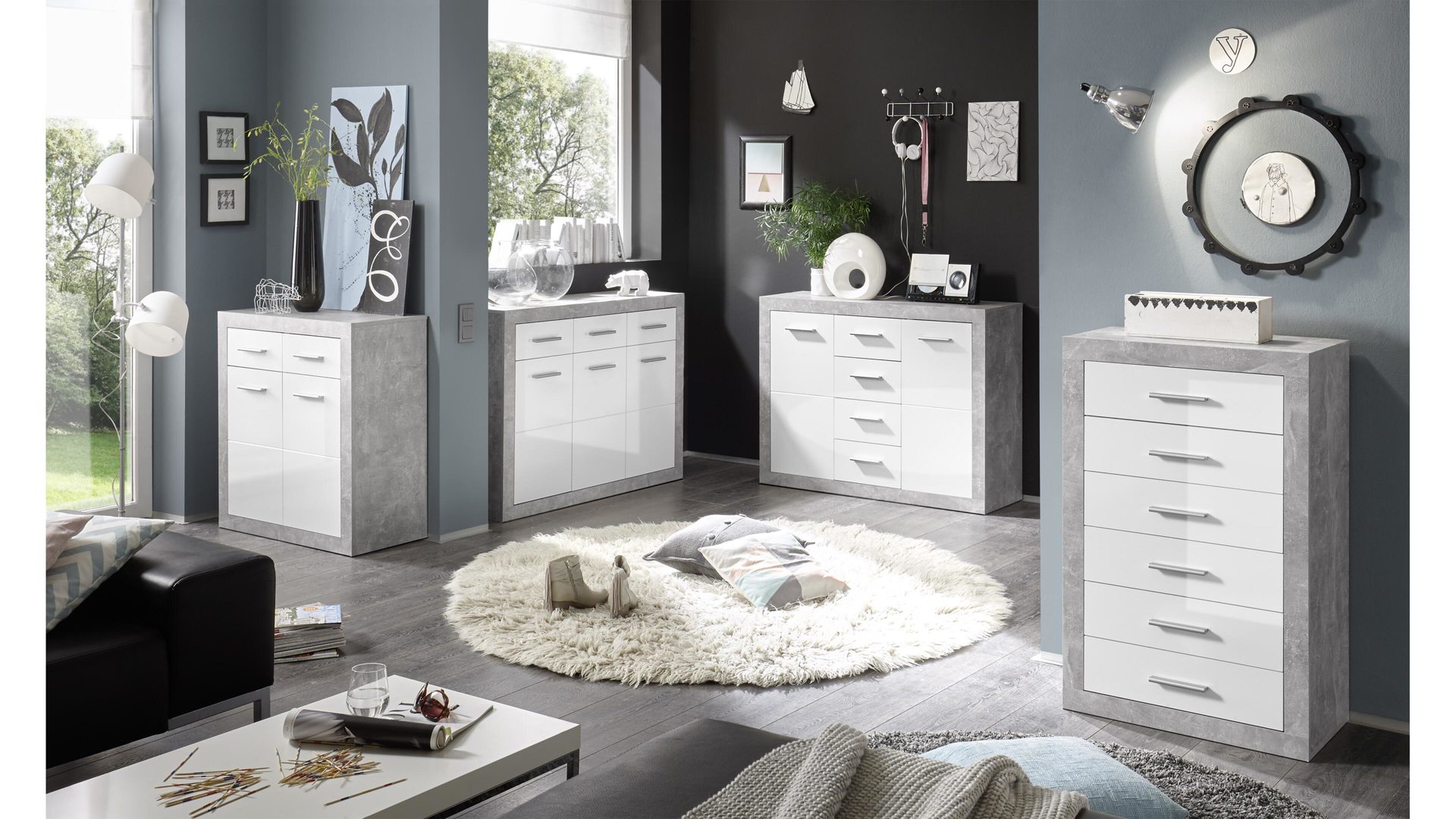 Dank ihrer außergewöhnlich stilvollen Design-Merkmale ist die Kombikommode Stone ein echter Blickfänger. Sie präsentiert sich in edler Beton-Nachbildung kombiniert mit weißen Hochglanzoberflächen. Diese spezielle Farbverbindung harmoniert vorzüglich miteinander und strahlt eine Menge Eleganz aus. Akzente setzen die chromfarbenen Griffe.
