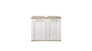 Auch der Waschbeckenunterschrank ist zweitürig aufgebaut. Im Inneren befindet sich ein Boden, der den Schrank in zwei Bereiche unterteilt. Die Maße belaufen sich auf ca. 80 x 65 x 33 cm (BxHxT). Für ein harmonisches Gesamtbild positionieren Sie den ca. 80 x 70 x 20 cm (BxHxT) großen Wandspiegel mit praktischem Ablageboden über dem Waschbeckenunterschrank.
