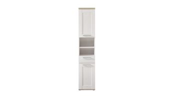 Neben der Optik begeistert auch die Funktionalität der Badmöbel. Der zweitürige Hochschrank weist hinter den beiden Türen jeweils einen Holzboden auf, sodass Sie viel Raum haben, um lichtempfindliche Kosmetika sicher zu verstauen. Darüber hinaus beherbergt der Hochschrank zwei offene Fächer und eine Schublade. Er misst gesamt ca. 39 x 190 x 33 cm (BxHxT).