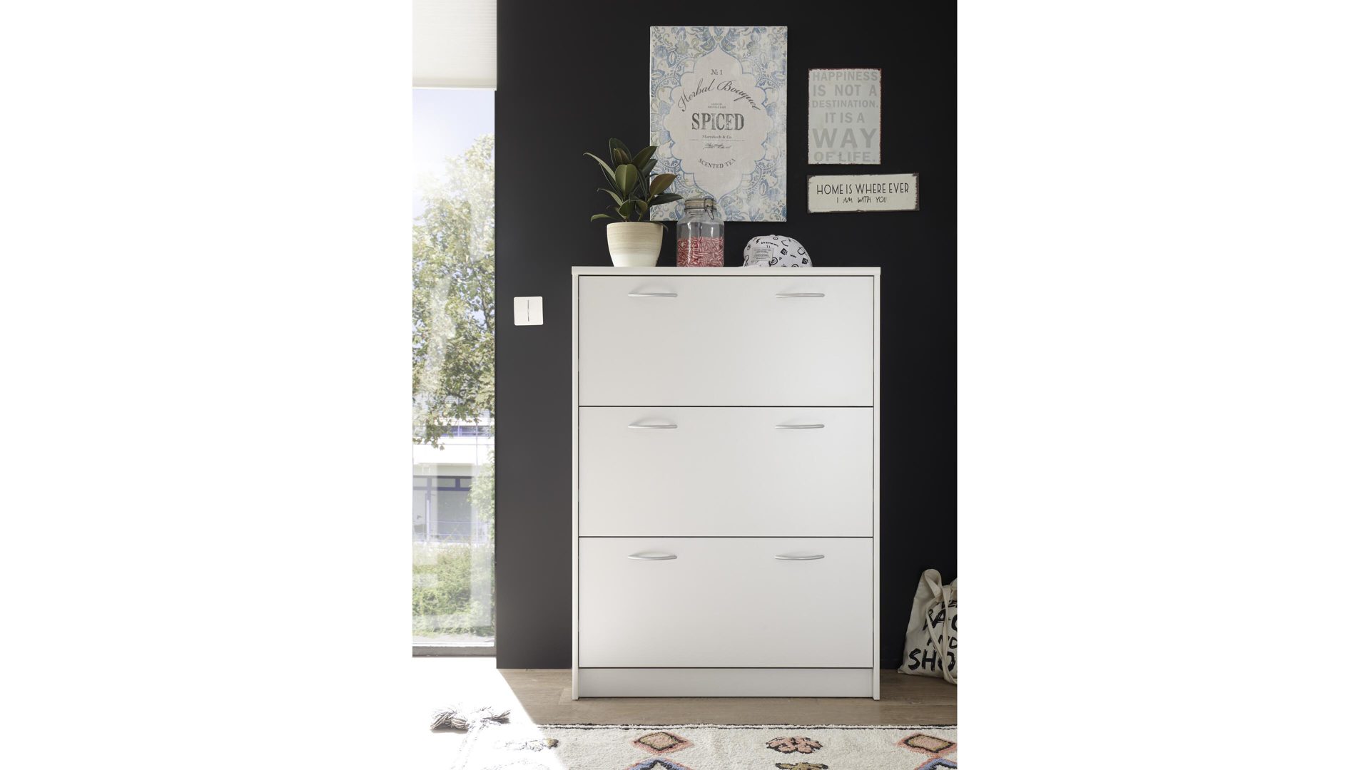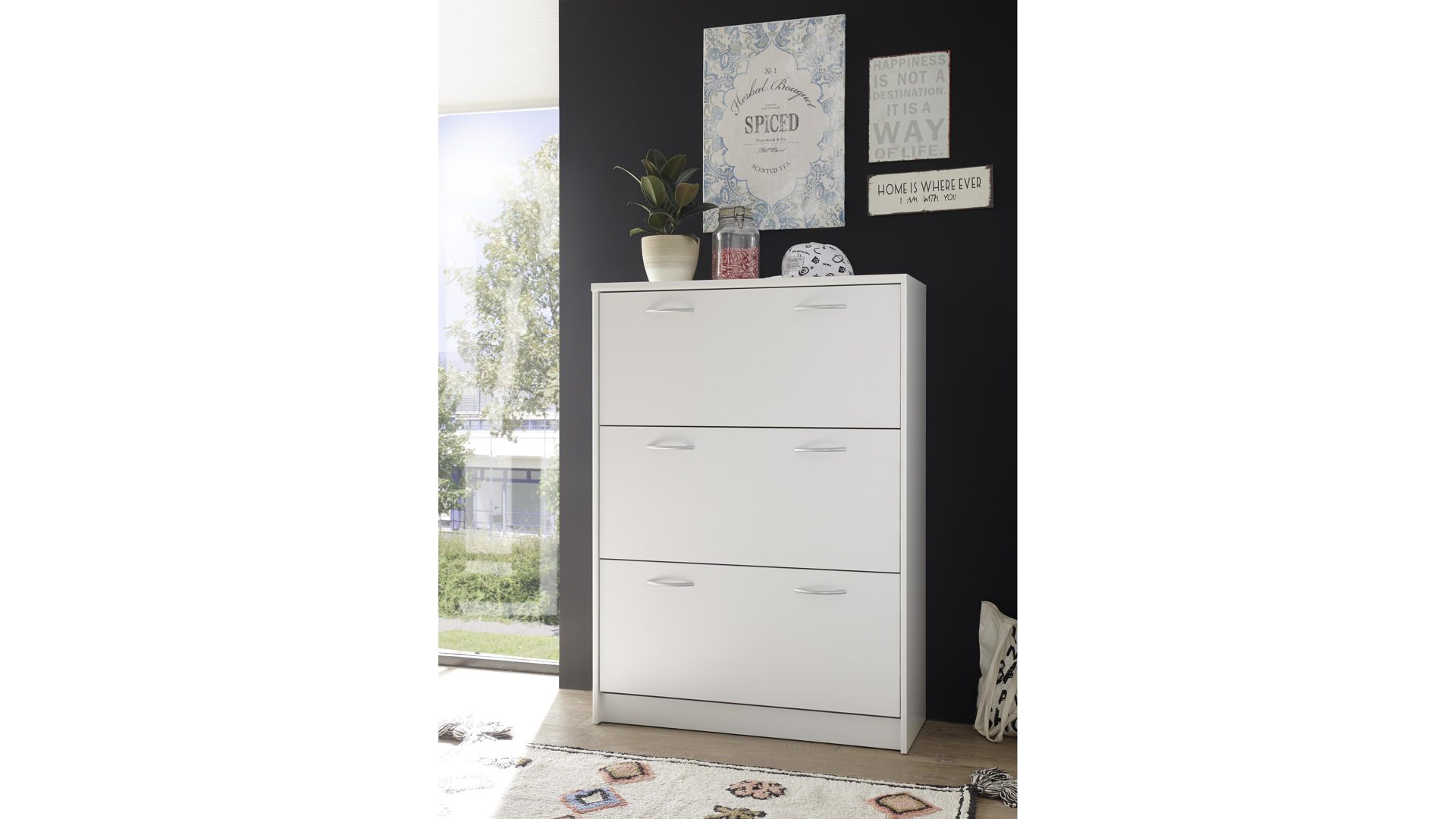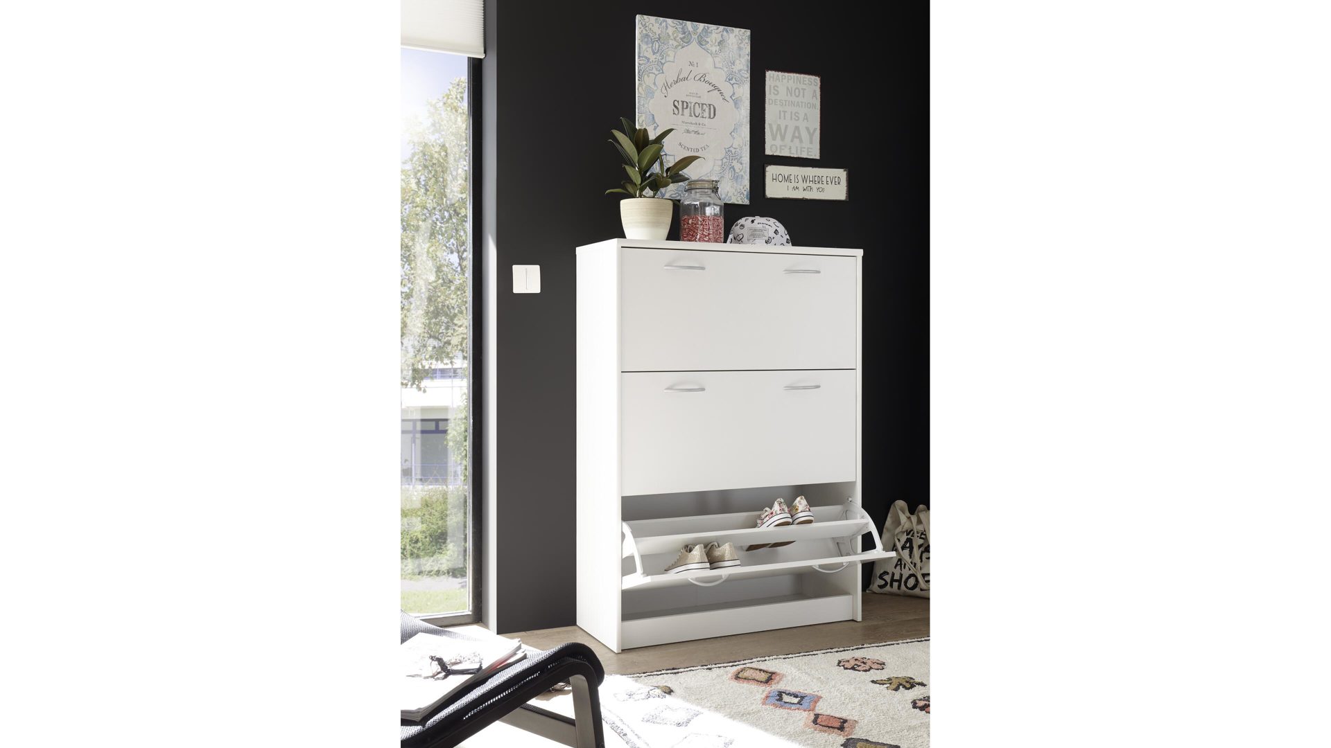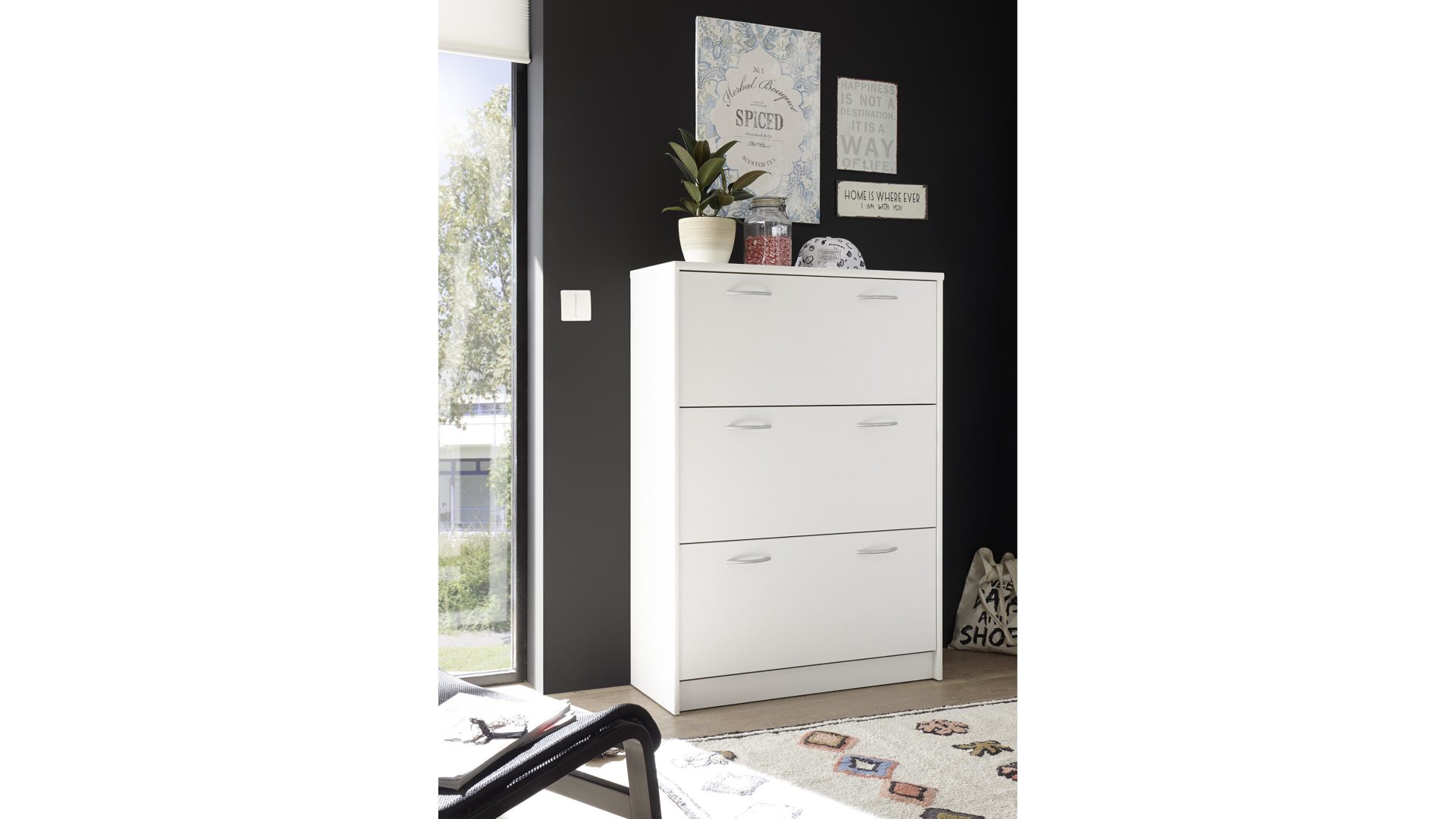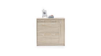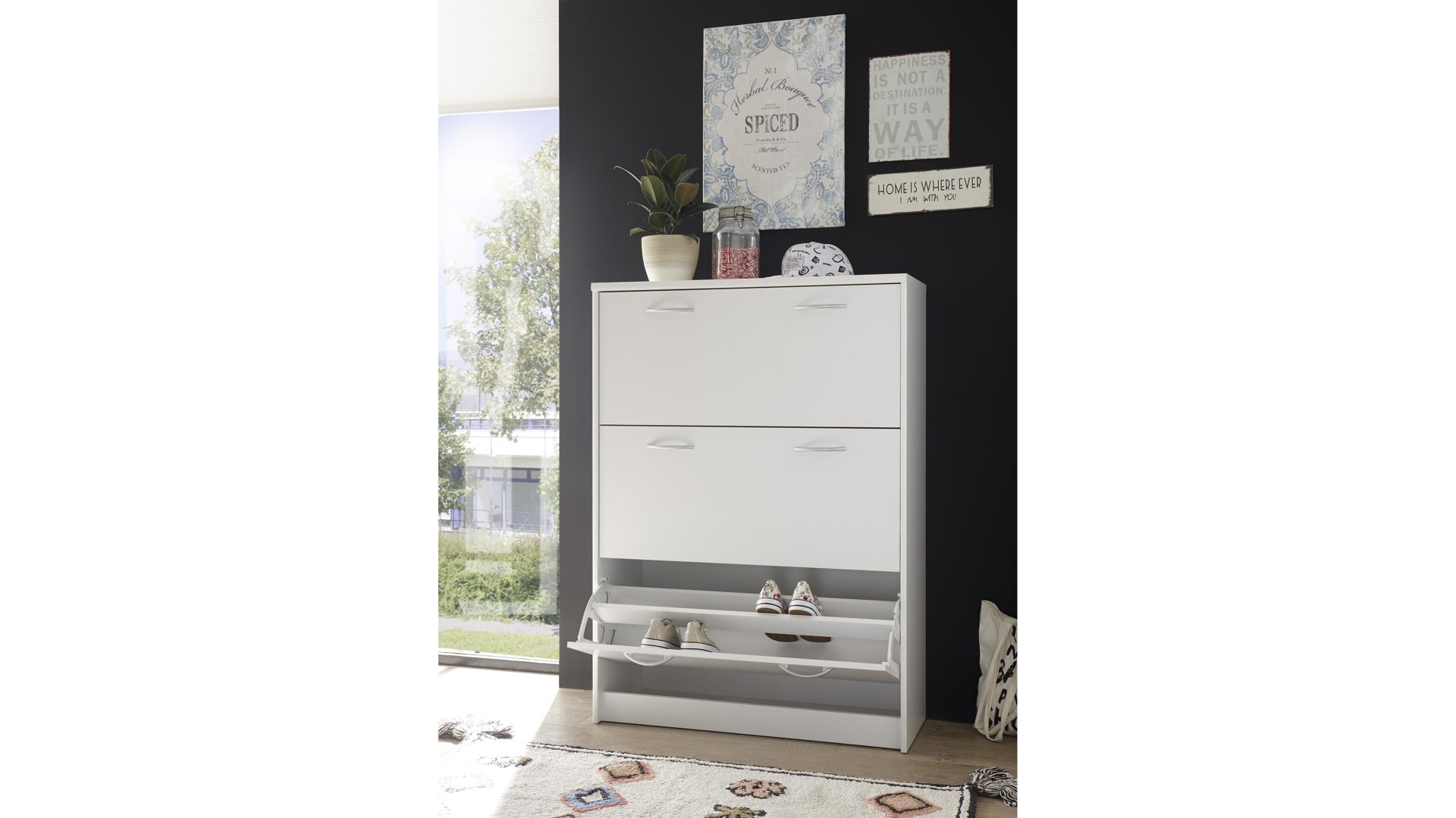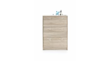 Neben den optischen Vorzügen bieten die Kunststoffoberflächen einen entscheidenden funktionalen Vorteil. Sie sind besonders pflegeleicht, was Ihnen die Reinigung immens erleichtert. Hinter den drei Klapptüren der erstklassig verarbeiteten Schuhkommode finden Sie viel Stauraum für Ihre schönsten Schuhe, die Sie bestens geschützt aufbewahren möchten. Die Maße des edlen Schuhkippers betragen ca. 87 x 123 x 36 cm (BxHxT).
