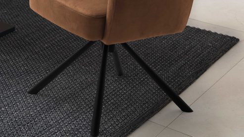 cognacfarbener Bezug im Vintagelook und rundes, konisch zulaufendes, mattschwarzes Metallgestell