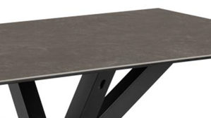 Der Tisch Heaven kombiniert ein Gestell aus mattschwarz pulverbeschichtetem Metall mit der schwarz marmorierten Keramik-Tischplatte Fairbanks auf einer schwarzen Glasplatte.