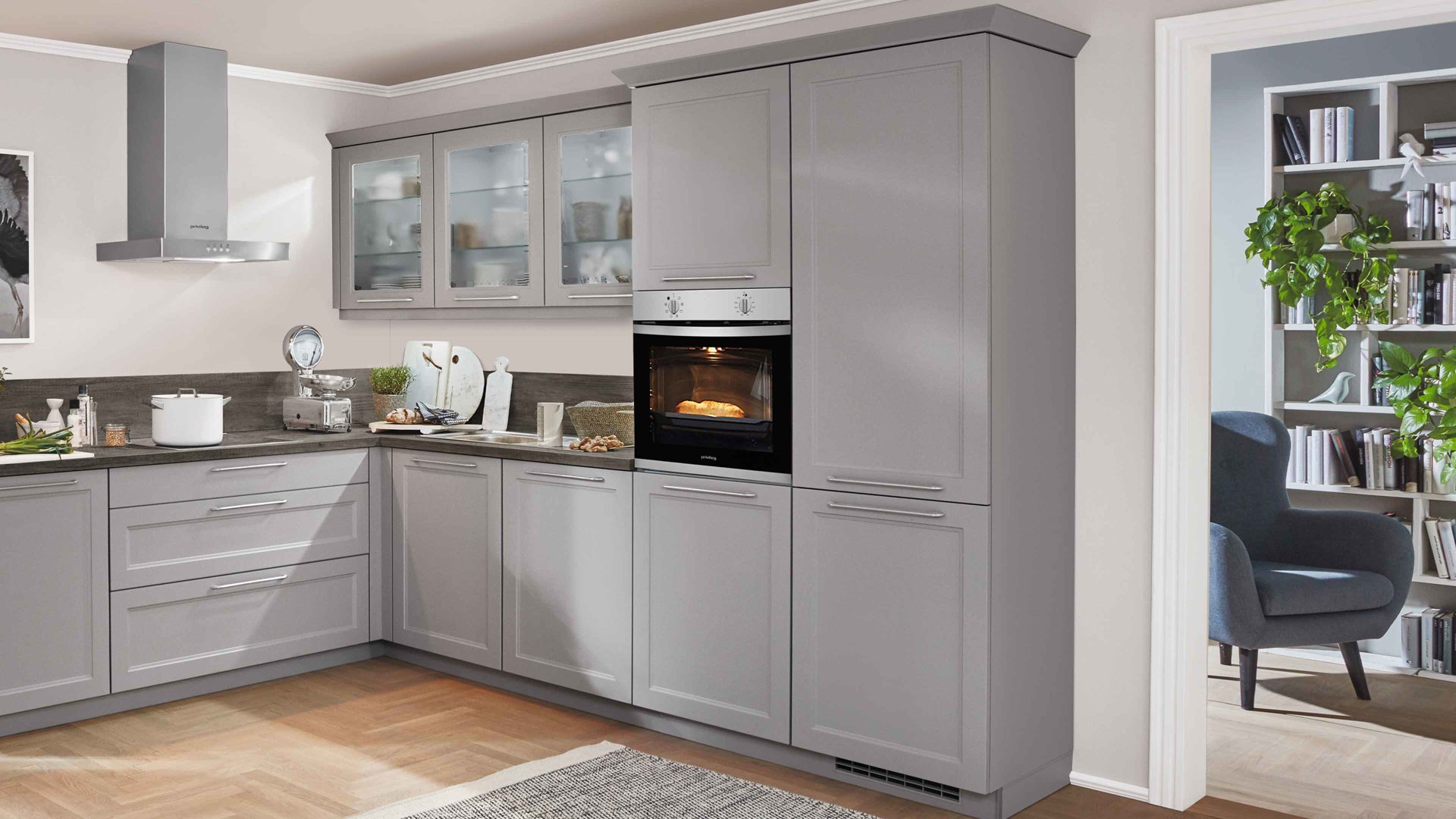 Die moderne nobilia® Einbauküche Cascada im angesagten Landhaus-Look kombiniert steingraue Kunststoffoberflächen und Sockelblenden mit einer Arbeitsplatte und Nischenverkleidung in Dakota Eiche-Nachbildung. Edelstahlfarbene Metallgriffe runden die Optik stilsicher ab. Durch die perfekt aufeinander abgestimmten Farbtöne strahlt die qualitativ hochwertige Systemküche puristische Eleganz mit natürlich anmutendem Charme aus.