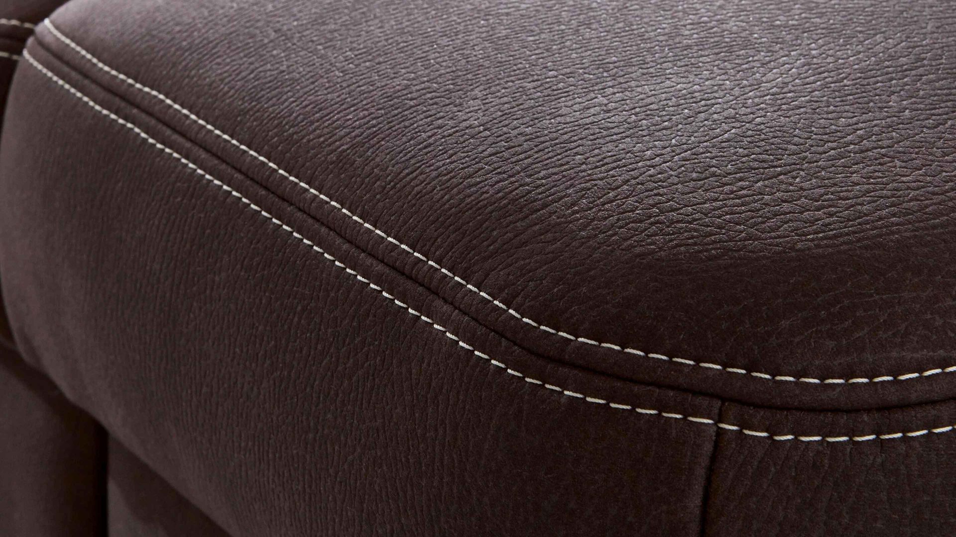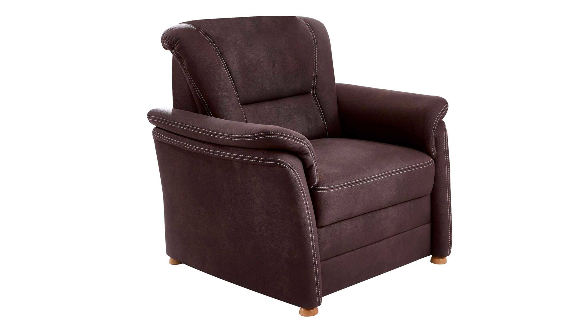 Der schokobraune Mikrofaserbezug mit beiger Kontrastnaht und die biancofarbenen Eichenholzfüße harmonieren hervorragend miteinander und sorgen für eine warme Atmosphäre im Lesezimmer oder Wohnbereich. Der Rücken des ca. 101 x 96 x 92 cm (BxHxT) großen Polstermöbels ist stoffbezogen, weshalb es sich unter anderem als Hingucker mitten im Raum bewährt.