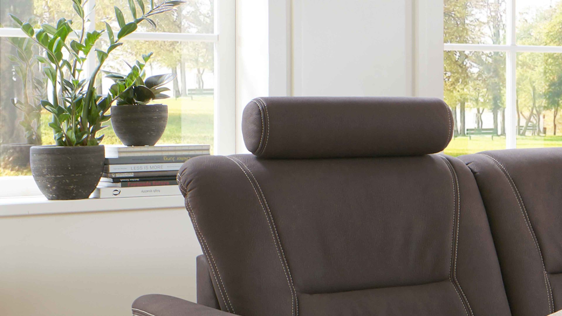 Bei der Kopfstütze KS handelt es sich um ein Mehrpreis-Zubehör für mehrere Möbel aus dem Modulmaster-Programm MM-PP1067. Sie weist einen schokobraunen Mikrofaserbezug mit Prägung auf und bringt zudem eine Kopfstützenvorrichtung aus verchromtem Metall mit.